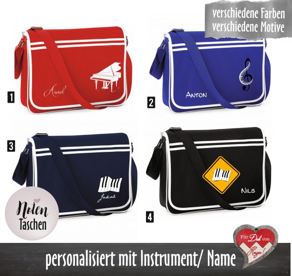 Für kleine und große Musiker, die Stolz darauf sind ein tolles Instrument zu erlernen oder schon zu beherrschen, sind diese Taschen ein beliebtes Geschenk. Ob zu Weihnachten, Geburtstag, Konfirmation oder Kommunion, Du landest damit sicher einen Volltreffer. Im Preis inbegriffen ist der Aufdruck des Instrumentenmotiv´s und auf Wunsch auch der Name oder das Monogramm.
