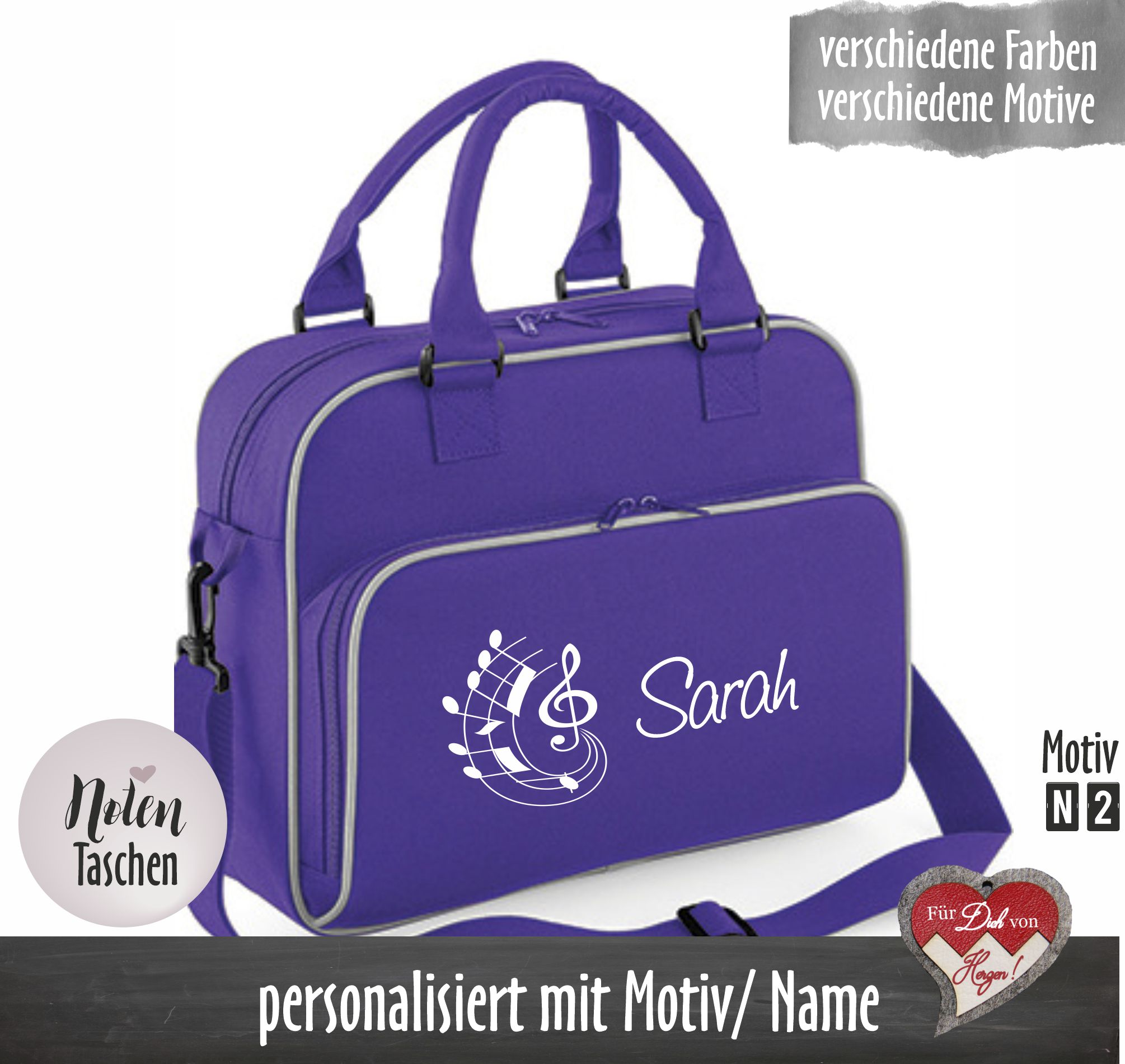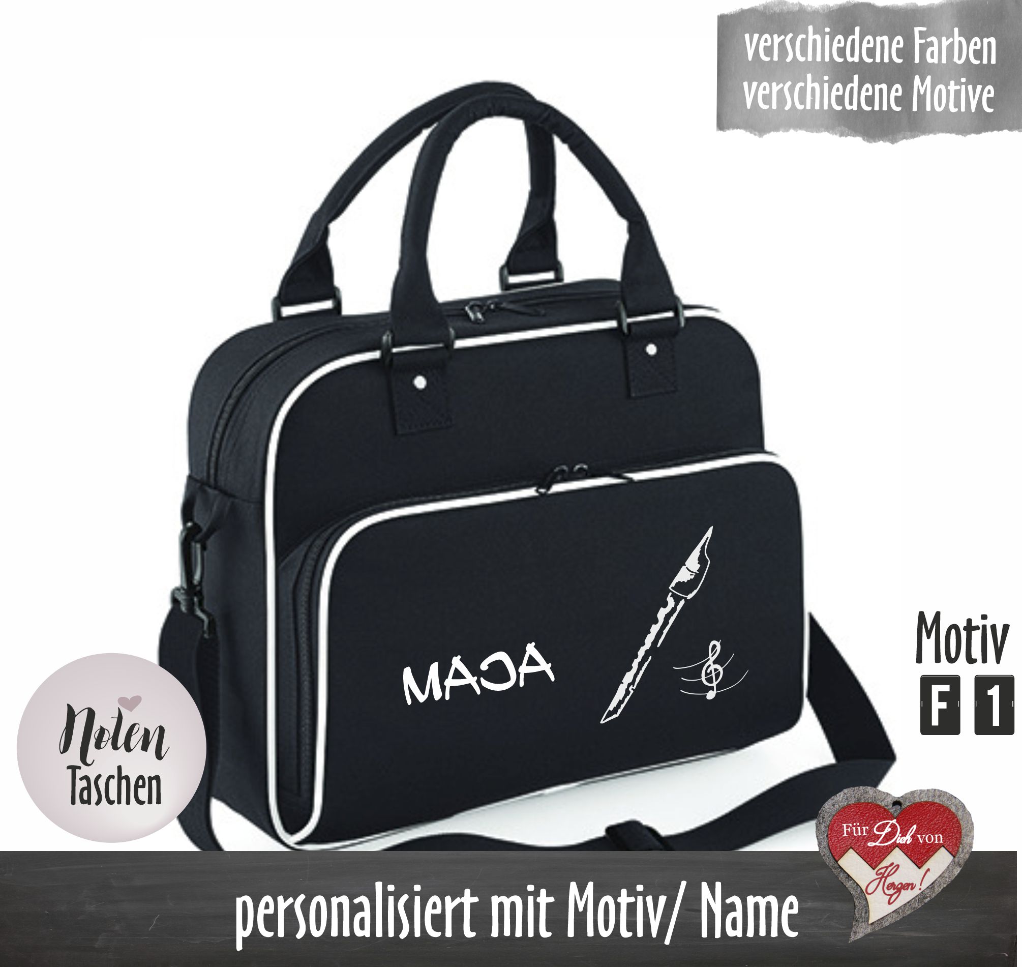 Diese Tasche ist das ideale Geschenk für alle jungen Musiker. Bedruckt mit einem passendem Instrumentenmotiv wird die Tasche zum echten Hingucker. Personalisiert mit dem Namen und dem Monogramm wird zu einem unverwechselbaren Unikat in der Notenhefte und ein schmaler A4 Ordner gut Platz haben.