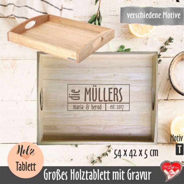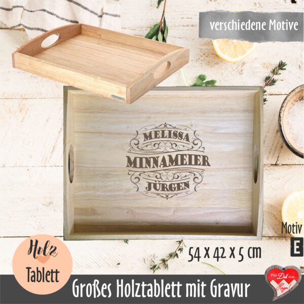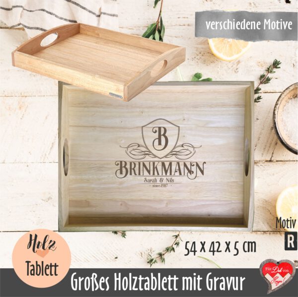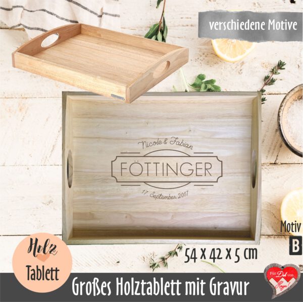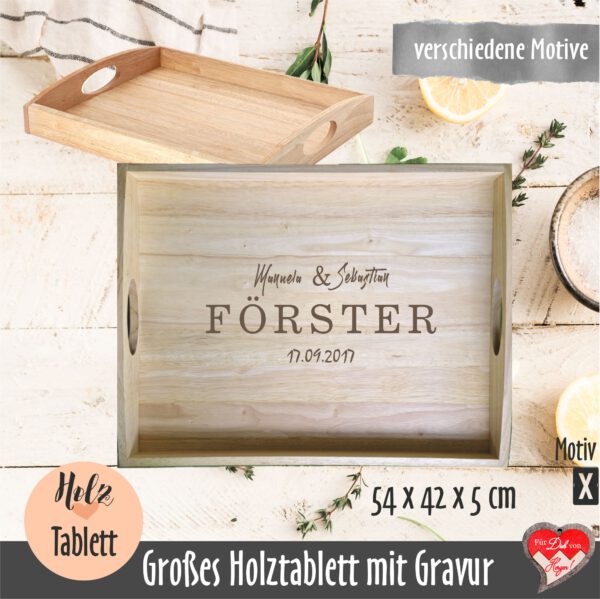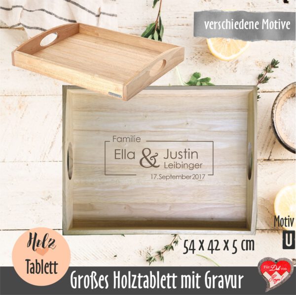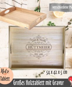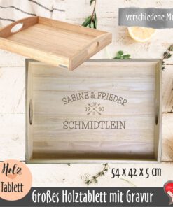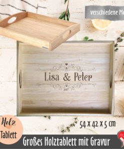 Das stabile Holztablett aus hellem Massivholz (Gummibaum) wird zusammen mit einer Gravur zu einem tollen Unikat. Als Geschenk mit hohem Erinnerungswert wird es gerne zur Hochzeit, Silberhochzeit, Verabschiedung eines Kollegen oder Ruhestandsgeschenk verwendet. Das warme Gummibaumholz passt in jedes Ambiente. Die flache Ausführung mit den großen Griffmulden machen es zu einem besonders platzsparendem Tablett.
