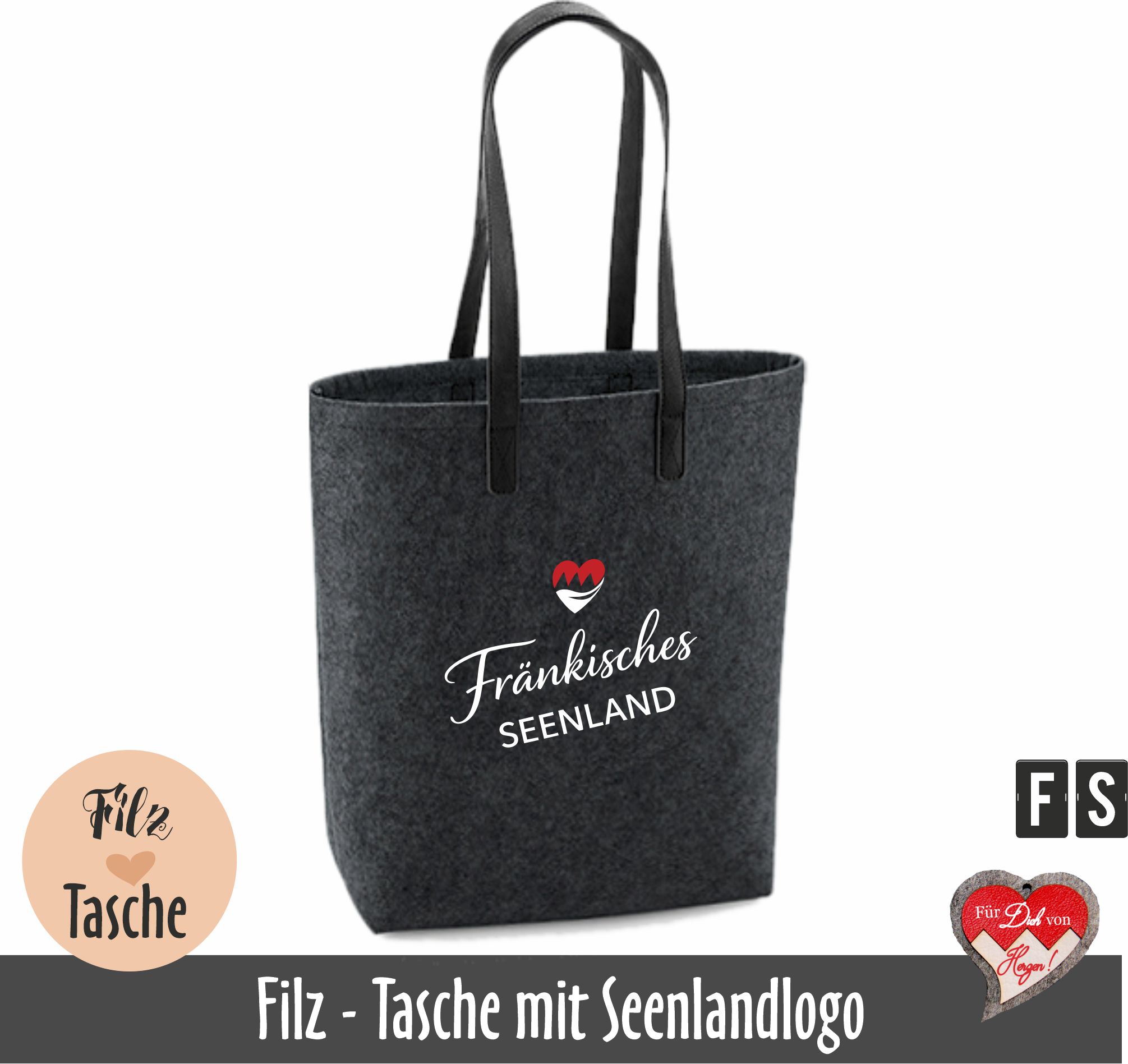 Diese Umhängetasche aus dunkelgrauem Filz und langen Kunstledergurten ist ein echter Hingucker und ein schickes, sowie nützliches Urlaubssouvenir aus dem fränkischen Seenland.